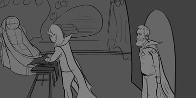Here are most of the storyboards done for the short. These were done in stages at various points of development, so style and detail varies a bit. You may notice I started using different brushes partway through, and some panels even have some splashes of colour to help with concepts.