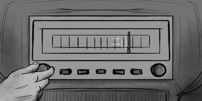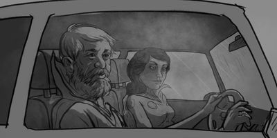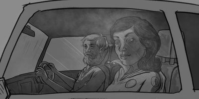 Glen sits down, takes a deep breath and opens the envelope. MS>MCU (Dolly) - Tracking in on Glen from front of car. * Dolly of track
