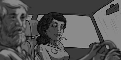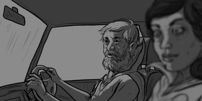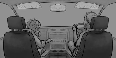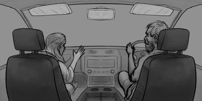 Glen cranes his neck around. MS (STATIC) - From the backseat of the car.