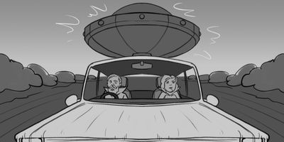 WIDE (STATIC) - All you see is the spaceship above the car and the landscape flying by. * Attached to the car. Maybe slow motion, Need car rig (school has a mo rig)