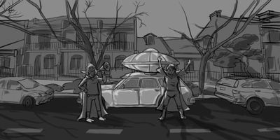 Glen returns to the Kingswood to find an envelope under the windscreen wiper. LS>WIDE (Dolly) - Tracking parallel with Glen. * Using the same track from Scene 11